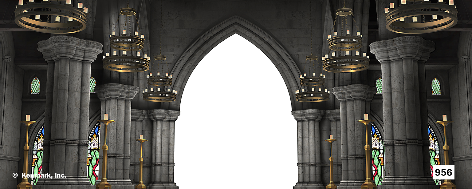 Castle Interior is a gorgeous theatrical backdrop with a cut-out door for stage exits and entrances. The drop works well as a castle or gothic church interior and was designed to be used for Shrek, Sister Act, Sound of Music or other shows. For a truly stunning look, pair it with D958 Cathedral Tab. Castle Interior is printed on digi-heavy fabric and has grommets across the top with tie lines for hanging. There is also a pocket on the bottom in the back so you can weight the drop with a chain or pipe if you choose.