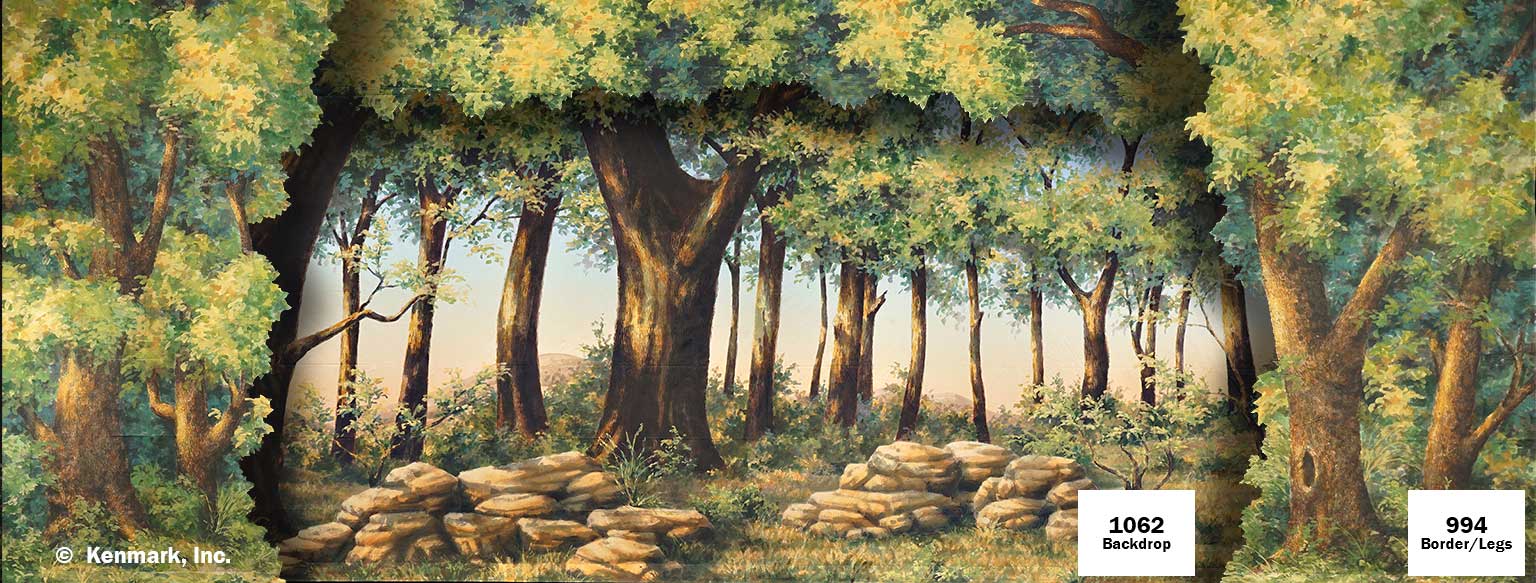 D994 Forest Border-Legs is one of our newest Forest Border/Leg sets. It was designed to match one of our full-size drops such as D1062 Golden Forest, but could easily be paired with other forest backdrops. Perfect for any show using a forest scene such as As You Like It, Shrek, or Cinderella. It works beautifully on it’s own or paired with a full-sized drop. D994 Forest Border-Legs is hand-painted on muslin. It is a three-piece set with grommets across the top of each piece with tie lines. Each piece also has a pocket on the bottom back, so you can weight the drop with a pole or chain if you choose.