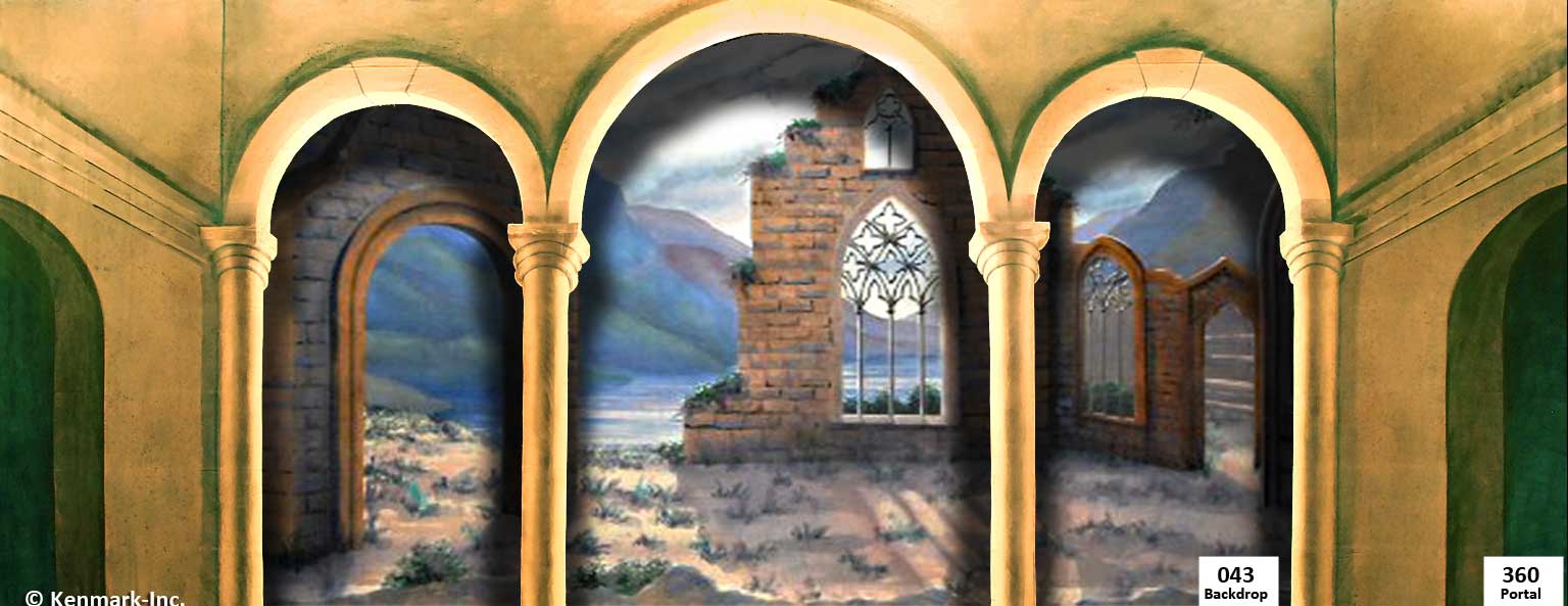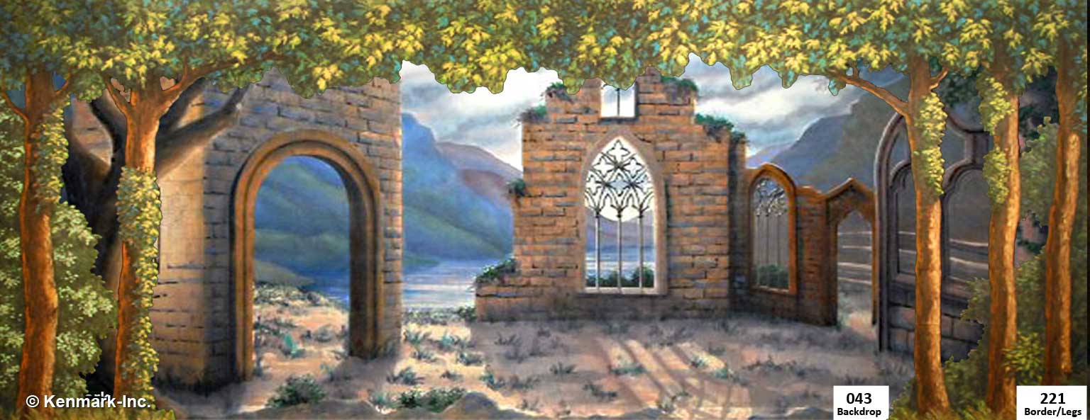 This drop was originally designed for BRIGADOON, but it has also been used for PIRATES OF PENZANCE. Washed in blue, this backdrop makes a lovely nighttime scene.