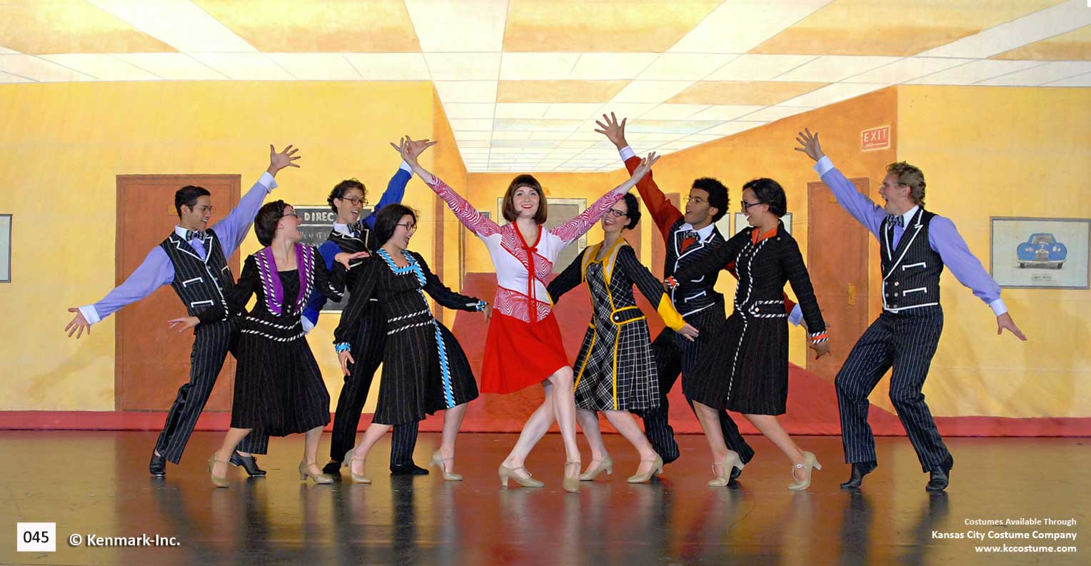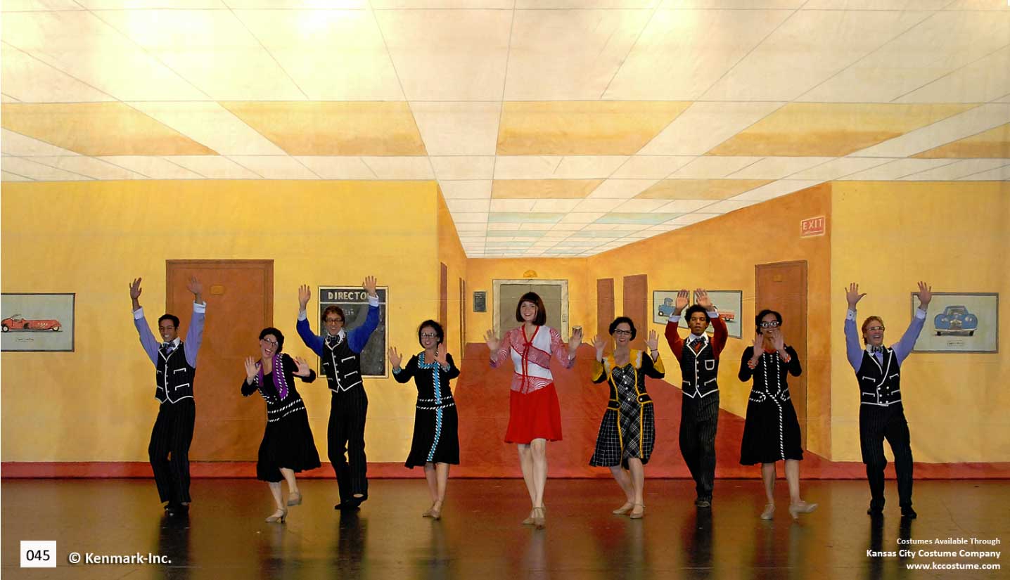 Office Corridor theatrical backdrop is usually used for How to Succeed in Business Without Really Trying or Promises, Promises and any office scene on stage. In addition to an office, it can also be used as a school hallway. Office Corridor features a tile ceiling, neutral walls and vintage car pictures and a directory hanging on the walls. It is hand painted on muslin and measures 17.5 feet high and 42 feet wide. It has grommets across the top with tie lines for hanging and a pocket on the bottom in the back for a pole if you’d like to weight the drop.