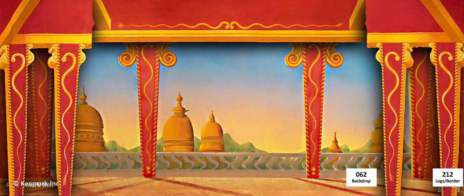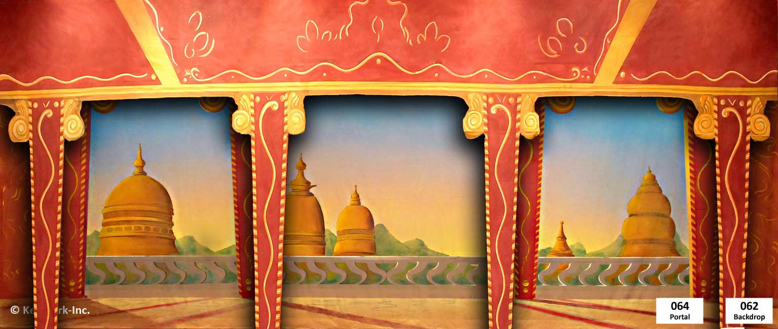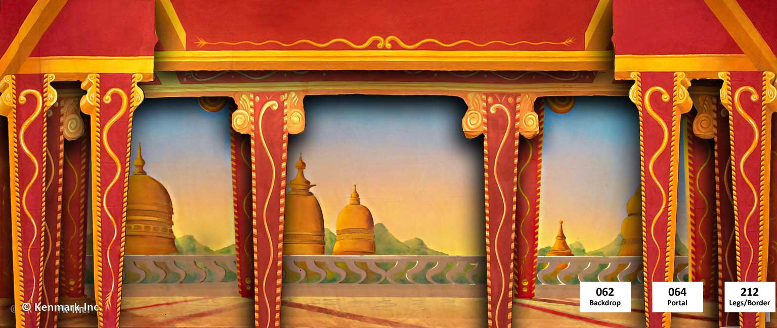 Beautiful Royal Palace backdrop for THE KING & I. There is also a matching 3-piece Leg Set (D212) and a Siamese Portal (D064) which are designed to accentuate this drop and to add wonderful dimension to your scene.