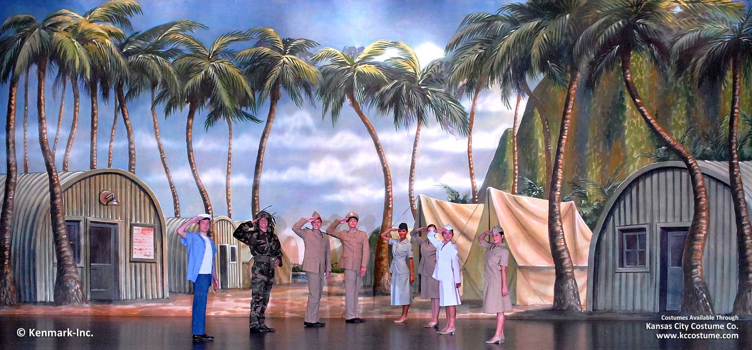 Everyone will recognize this Quonset Hut & Tent Barracks backdrop from SOUTH PACIFIC. We have used this beautiful drop for numbers in talent shows, and dance revues. If you need a smaller version of this drop, check out D247 Quonset Hut & Tent Barracks 17' x 43'. If you are doing SOUTH PACIFIC, be sure to look at our complete SOUTH PACIFIC package!