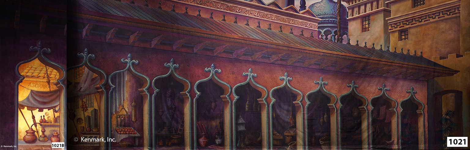 Marketplace is a stunning backdrop that will transport you to the Middle East where you can practically smell the exotic aromas and feel the jostle of the customers trying to vie for the attention of the shop keepers. This beautiful drop can also be used with an additional translucent leg which can be backlit for a gorgeous effect and to provide an entrance and exit to the Marketplace street. This drop would be perfect for Aladdin or any show with a Middle Eastern scene. Both pieces are hand-painted on muslin with grommets across the top with tie lines for hanging. There is also a pocket on the bottom back of each piece so you can weight the drops with a pipe or chain if you choose. Additional Leg: $100