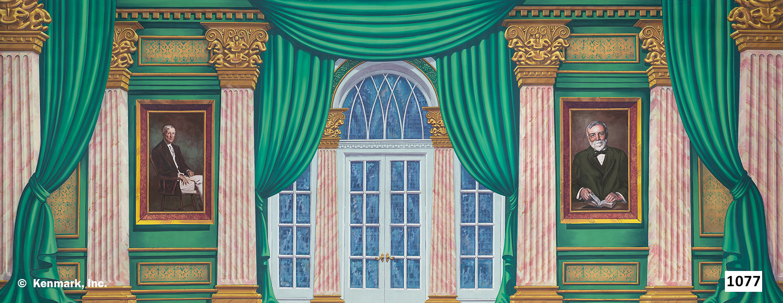 This is a stunning mansion interior done in the green of money! Perfect for Daddy Warbuck's mansion in Annie it has beautiful, stately columns, captivating windows and lush green drapes. It also features two large portraits that are perfect for the period.