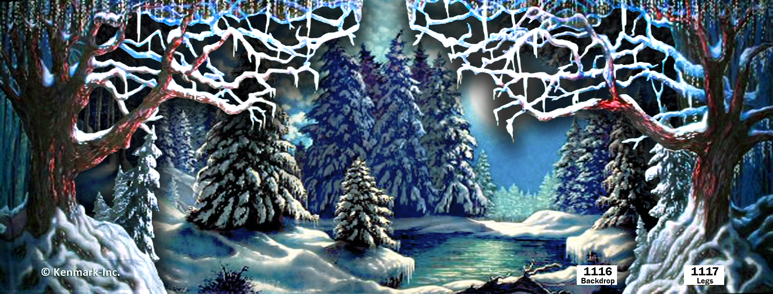 Snow Forest is a gorgeous moonlit forest shimmering with pine trees covered in snow and a sparkling blue pond. For added depth and a spectacular look, pair it with one of our Snow Forest leg sets such as D400 D963, D893, D894, or D895. D407 Snow Forest is perfect for The Nutcracker, The Lion the Witch and the Wardrobe, or any show where you want a pristine winter forest setting. The drop is 22′ high by 50′ wide and have grommets with tie lines across the top. It also has a pocket on the bottom in the back so you can weight the drop with a pole if you choose.