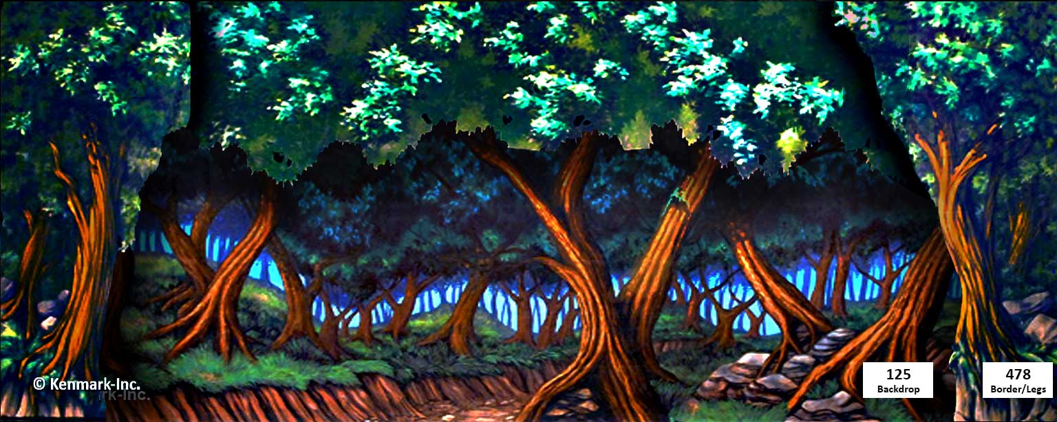 D125 Forest is a beautiful forest backdrop featuring thick green foliage and textured brown tree trunks. The land features green grass, a crevice and stones. It works well for any show requiring a dense forest, such as Beauty and the Beast, Shrek, Into the Woods or Wizard of Oz to name a few. For a truly spectacular look pair it with one of our Forest Border/Leg sets, such as D352 Forest Border/Leg set 20' x 50'. D125 Forest measures 20 feet tall by 50 feet wide. It is hand-painted on muslin and has grommets across the top with tie lines for hanging. There is a pocket on the bottom back, so you can use a pole or chain to weight the drop if you choose.