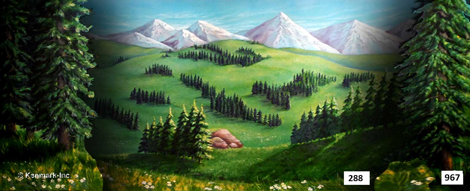 D288 Swiss Alps is a beautiful theatrical backdrop featuring majestic snow-capped mountains, deep green pines, with sweet alpine flowers and plush green fields. It is perfect for Sound of Music, Seven Brides for Seven Brothers or Heidi. D288 Swiss Alps is 17 feet high and 45 feet wide. It looks stunning on its own, or for a really spectacular look, pair it with D959 Swiss Alps - 17' Legs. Swiss Alps is hand-painted on muslin and has grommets across the top with tie lines. It also has a pocket on the bottom back so you can weight the drop with a pole or chain if you choose.