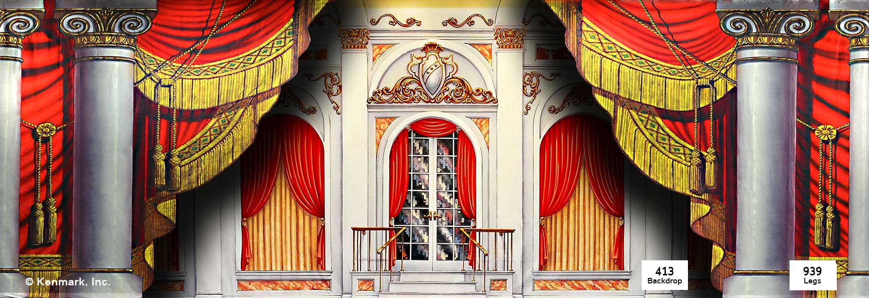 Stately Ballroom is an elegant cream colored ballroom with arched windows bearing crimson red and gold drapes. There is a small staircase leading to the double glass doors and a gold crest above the doors. It is frequently used for Nutcracker and can also be used for Annie Get Your Gun, Curtains, Thoroughly Modern Millie, Anything Goes and others. This stunning Stately Ballroom backdrop measures 20 feet wide by 50 feet high. It has grommets across the top with tie lines for hanging. It also has a pocket across the bottom in the back so you can use a pole if you choose to weight the drop. Stately Ballroom looks beautiful by itself or to create a spectacular look pair it with D939 Elegant Ballroom – Legs.