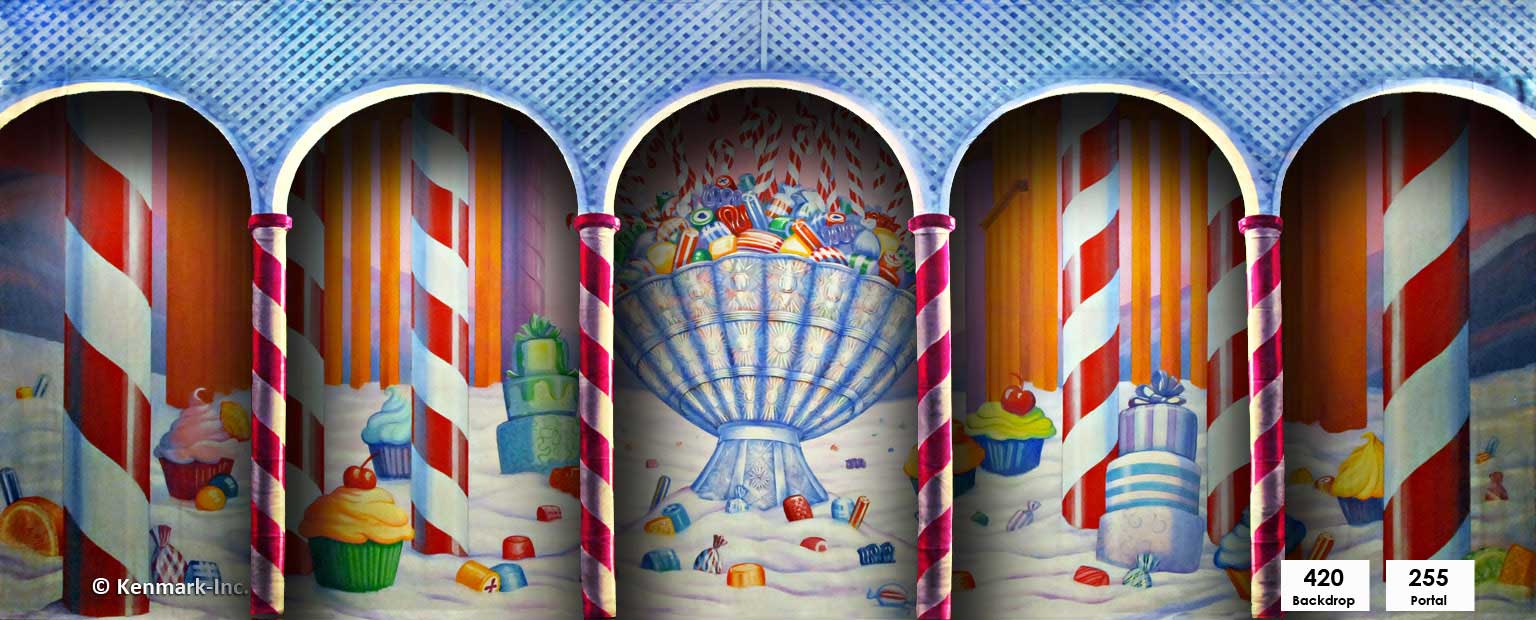 A stunning Kingdom of Sweets backdrop with a crystal bowl of colorful candy canes and other sweets front and center. Use it by itself, or pair it with one of our portals such as D255 Kingdom of Sweets Portal or D321 Kingdom of Sweets Portal to really bring your set to life.
