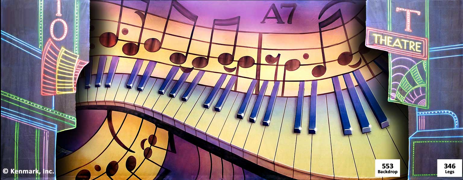Oversize piano keys sweeping across the backdrop give a super Cool Jazz look to the stage. To add depth and fun pair it with one of our leg sets, such as D346 Broadway Sign - Legs.