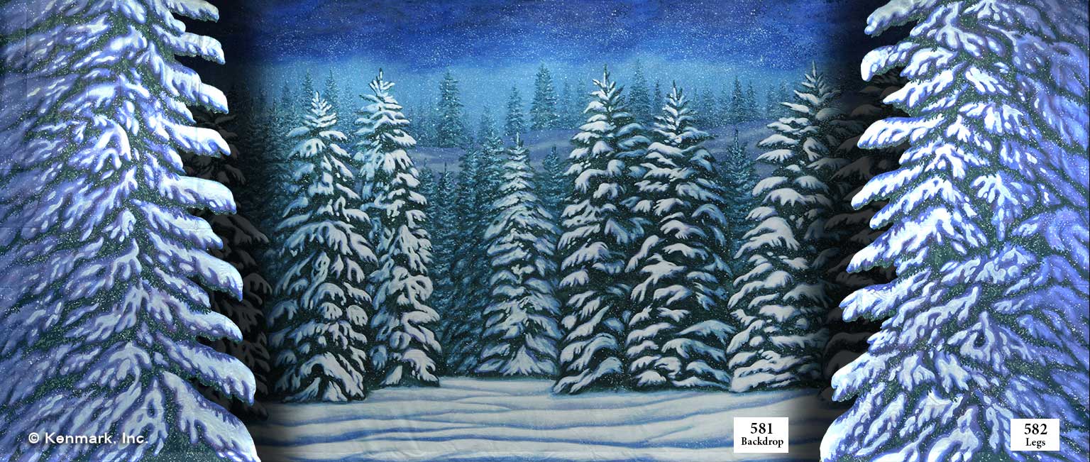Snow Forest theatrical backdrop that is typically used for The Nutcracker, but can be used anytime you need an outdoor winter scene. It's beautiful on it's own, but to really make a statement, pair it with one of our Snow Forest leg sets such as D582. Snow Forest measures 20 feet high by 47 feet wide. It has grommets across the top with tie lines and a pocket on the bottom in the back that can be used to weight the drop.