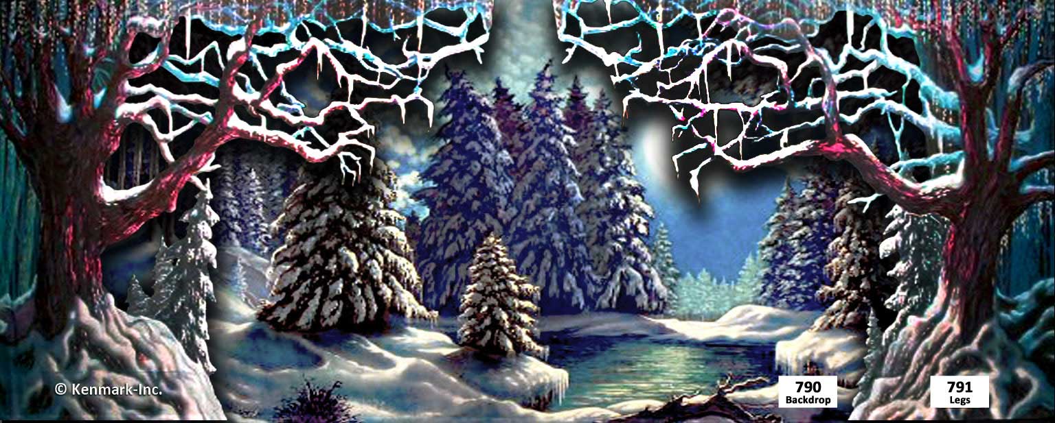 Snow Forest is a gorgeous moonlit forest shimmering with pine trees covered in snow and a sparkling blue pond. For added depth and a spectacular look, pair it with one of our Snow Forest leg sets such as D400 D963, D893, D894, or D895. D407 Snow Forest is perfect for The Nutcracker, The Lion the Witch and the Wardrobe, or any show where you want a pristine winter forest setting. The drop is 20′ high by 50′ wide and have grommets with tie lines across the top. It also has a pocket on the bottom in the back so you can weight the drop with a pole if you choose.
