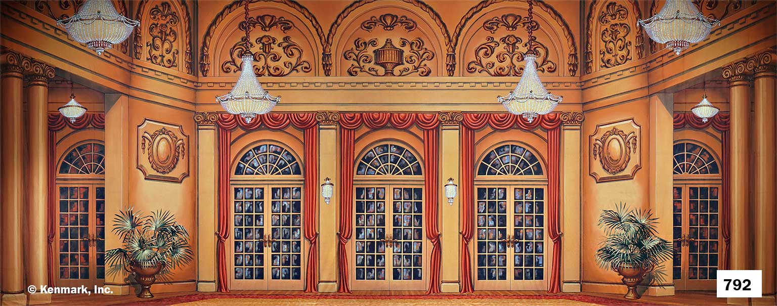 D792 Elegant Ballroom is one of the newest drops in Kenmarkâs Ballroom category. It is based on one of the most popular Elegant Ballroom scenes in our inventory! This stunning drop can be used for everything from MY FAIR LADY to the NUTCRACKER BALLET. Other versions available are D922, D097, D792, D823 and D804 (in grey/blue tones with red drapes). D792 Elegant Ballroom has creamy beige walls, deep, rich red drapes and gorgeous gold scroll work. It is approximately 20 feet high by 50 feet wide and has grommets across the top with tie lines for hanging. It also has a pocket on the bottom back so if you choose you can weight the drop with a pipe.