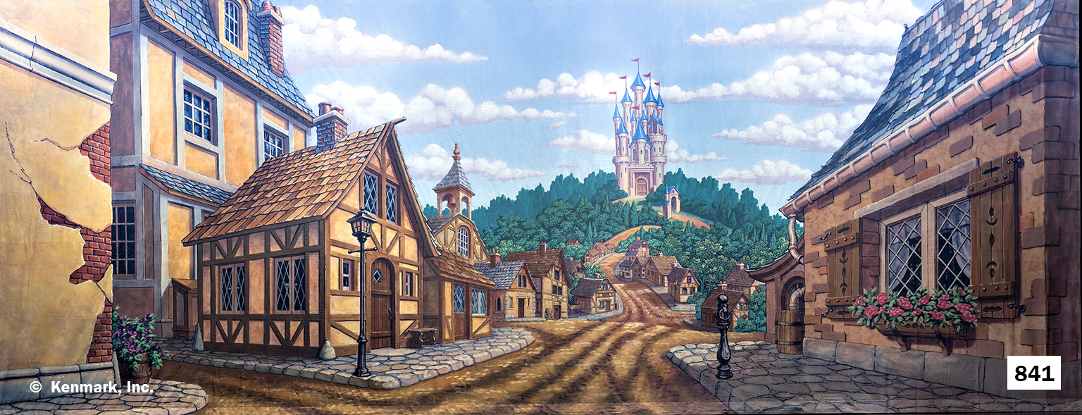 D841 Village with Castle is an enchanting backdrop that is perfect for shows such as Shrek, Sleeping Beauty, Cinderella or Beauty and the Beast. The design is lively and colorful features quaint stucco buildings with a dirt road leading to the charming white hilltop castle. Perfect for the Knights and Ladies of forever tymes! D841 Village with Castle is hand-painted on muslin and measures 17 feet high by 43 feet wide. It has grommets across the top with tie lines and a pocket in the back on the bottom so you can weight the drop with a pole or chain if you choose.