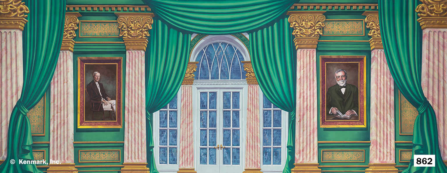 This is a stunning mansion interior done in the green of money! Perfect for Daddy Warbuck's mansion in Annie it has beautiful, stately columns, captivating windows and lush green drapes. It also features two large portraits that are perfect for the period.