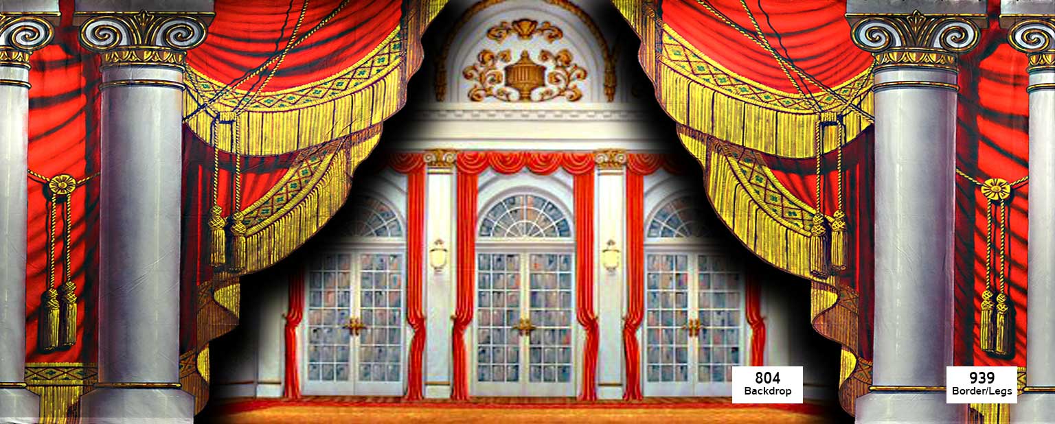 Elegant Ballroom Legs is a stunning theatrical backdrop that is frequently used for the Nutcracker. It could also be used for any production requiring an Elegant Ballroom setting such as Swan Lake. Elegant Ballroom Legs has light grey marble pillars and lush red drapes with gold fringe and tassels. It is perfect on it’s own and even more gorgeous when paired with one of our full sized ballrooms, such as D804 Elegant Ballroom Grey or D413 Stately Ballroom. Elegant Ballroom Legs is 20' high. Both legs have grommets across the top with tie lines for hanging. They also have a pocket on the bottom in the back that can be used to weight the drops with a pipe if you desire.