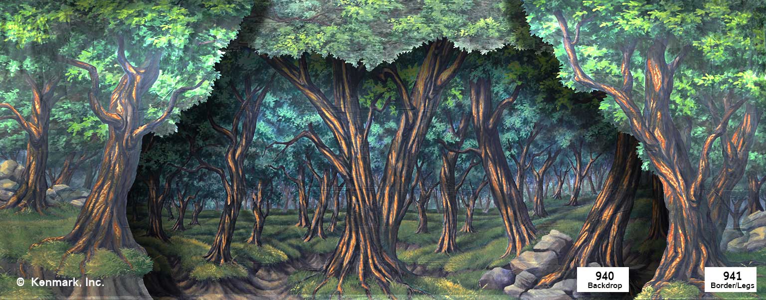Forest backdrop that is one of the newest in our Forest series of theatrical backdrops. With it’s gnarly tree trunks and dark green leaves, this Forest backdrop is perfect for a number of plays and musicals, including Into the Woods, Wizard of Oz, A Midsummer Night’s Dream, Beauty and the Beast and Cinderella. This enchanting Forest drop is a full size drop measuring 20 feet tall and 50 feet wide. It has grommets with tie lines across the top and a pocket on the bottom in the back for a pole to weight the drop. It is gorgeous when paired with D941 Forest Border/Legs.