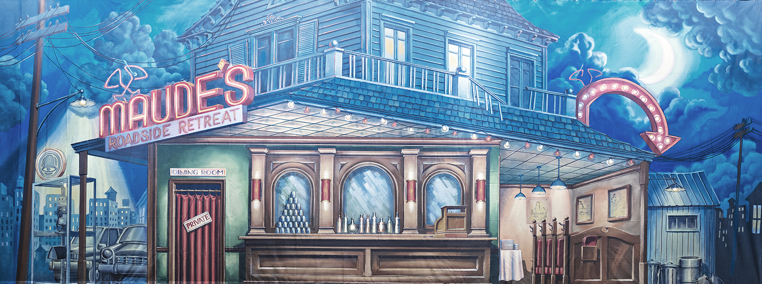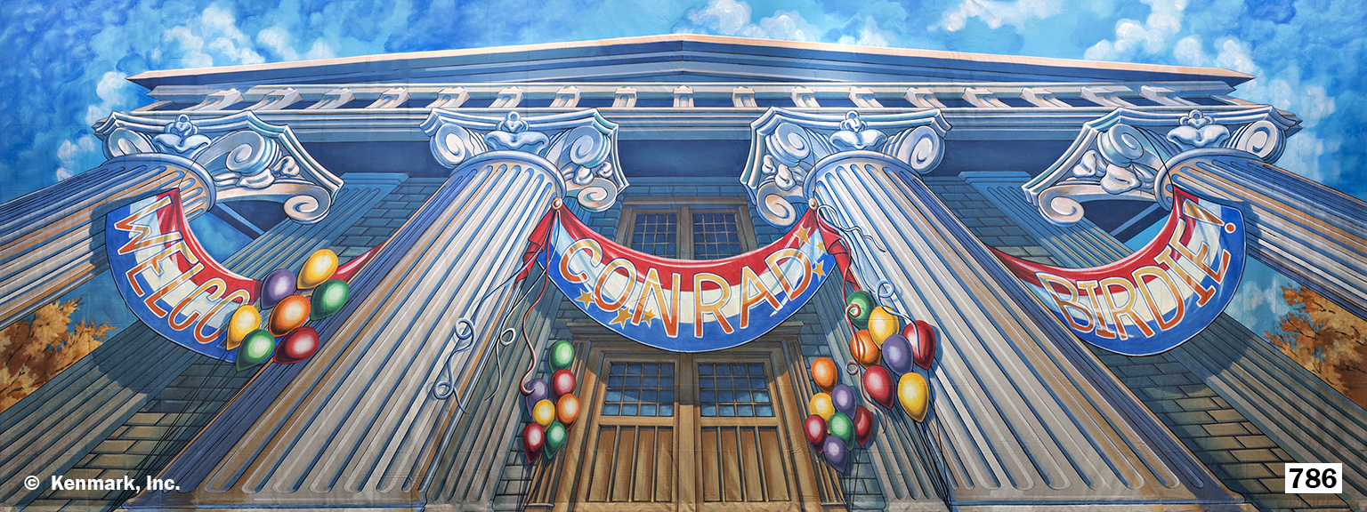 Beautifully hand-painted theatrical backdrops designed to provide continuity and quality to your “Bye Bye Birdie” set. These gorgeous drops are designed by Scenic Designer Jason Phillips and hand-painted by Master Scenic Artist Susan Crabtree. They are full-size drops measuring approximately 17′ x 45′. Each drop has grommets and tie lines across the top and a pocket at the bottom so you can insert a pole to weight the drop. The Bye Bye Birdie package has a total of 7 drops, with a minimum order of 4 required unless your ship date is within the next 30 days . You must order at least 4 drops to receive the package price. For additional information, visit our Rental Policies page. All backdrops are approximately 17′ x 45′.