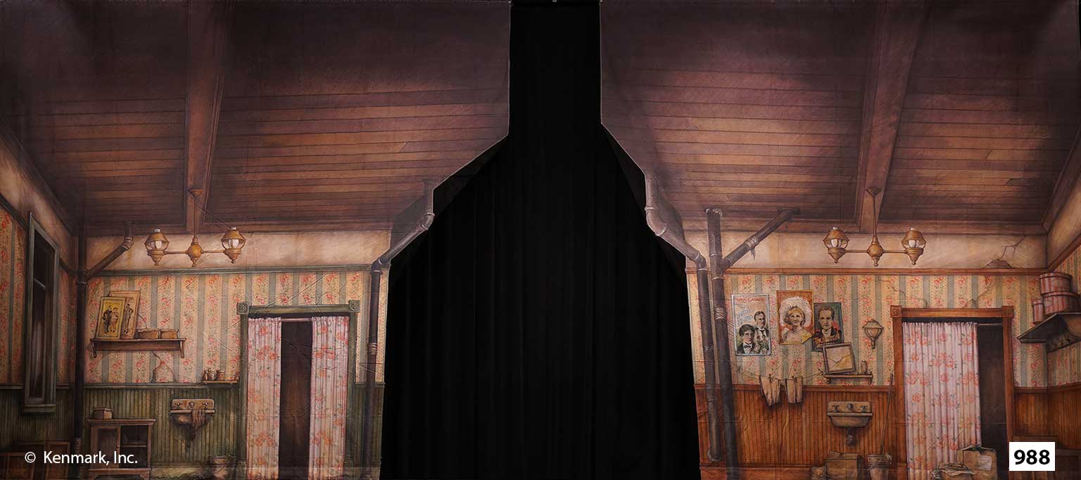 Crazy for You show package is a set of premium hand-painted theatrical backdrops designed by Scenic Designer Gregory Hill (Shrek, Peter Pan, Once Upon a Mattress, Guys and Dolls) to provide continuity and quality to your Crazy for You set. Hand-painted by Master Scenic Artist Susan Crabtree and her team. The complete Crazy for You package includes six drops and each full-size drop measures approximately 20 feet tall by 50 feet wide and has grommets across the top with tie lines for hanging. There is a pocket across the bottom on the back so you can use a pole to weight the drop if you choose. The Crazy for You package 1 has a total of 6 drops, with a minimum order of 4 required unless your ship date is within the next 30 days. You must order all 4 drops to receive the package price. All full-size backdrops are approximately 20′ x 50′ For additional information, visit our Rental Policies page. All prices are for a one week rental (Monday to Monday). A $500 deposit is required on all packages. Shipping is an additional charge. Renting for more than one week? Call 913-648-8125 for pricing!