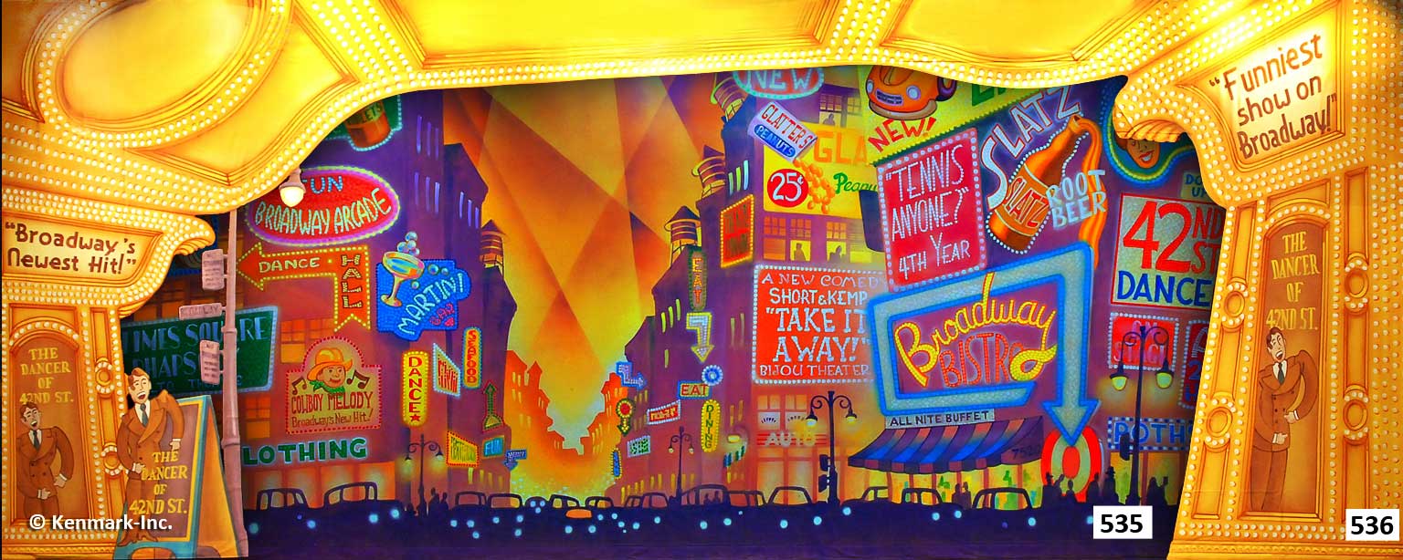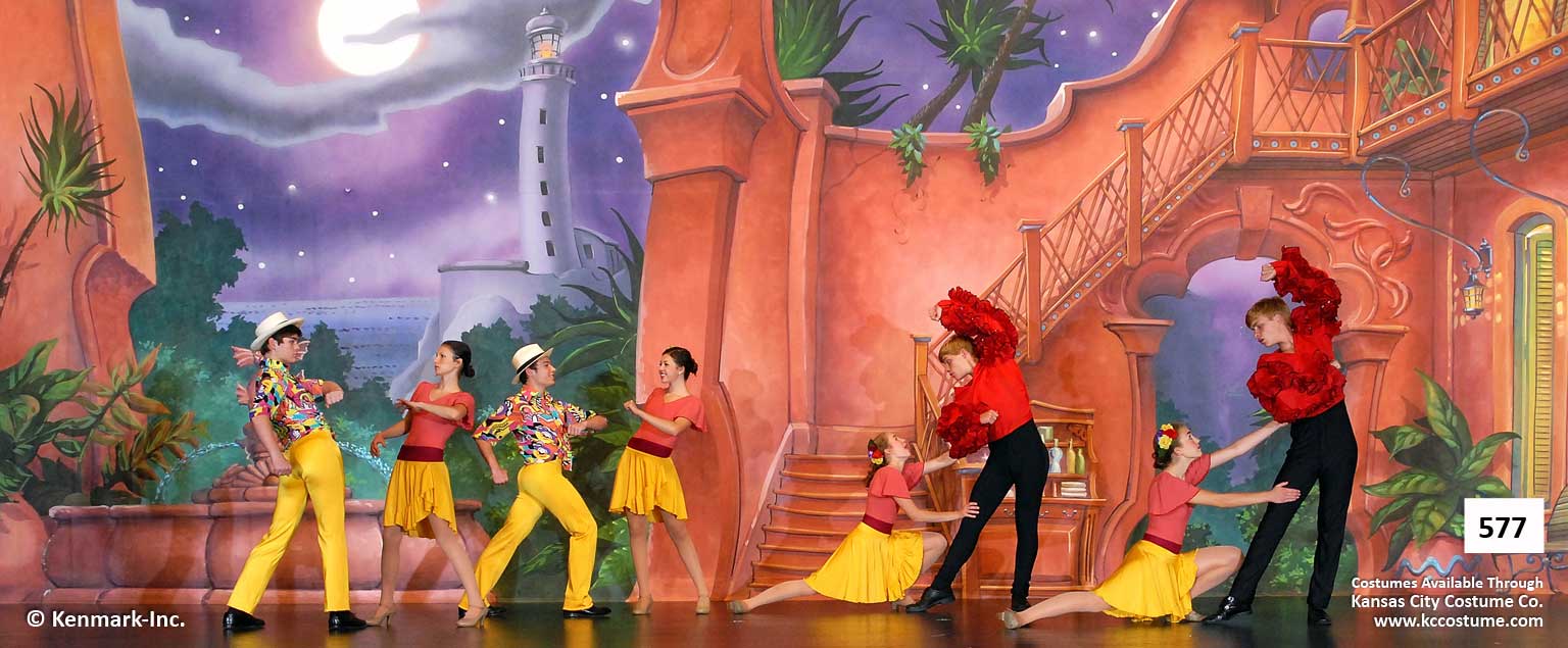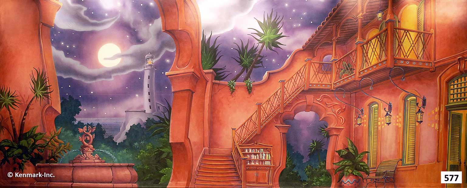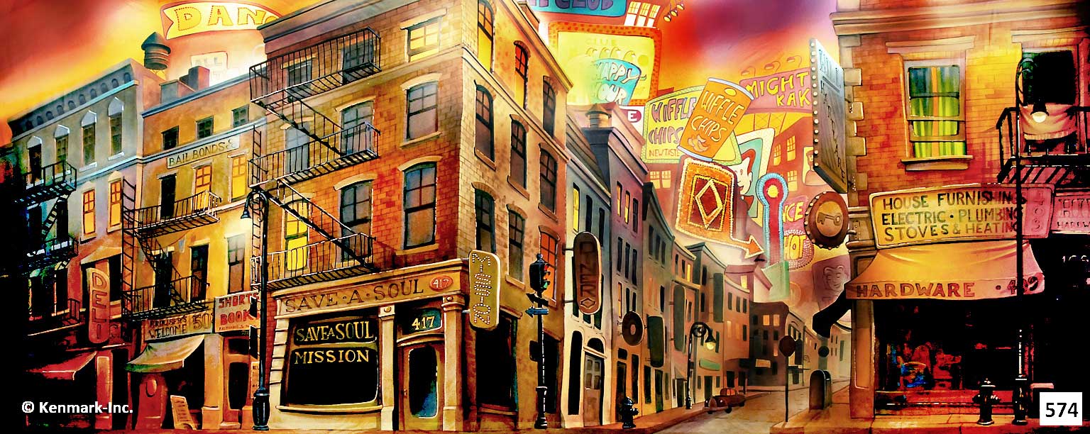 Beautifully hand-painted theatrical backdrops designed to provide continuity and quality to your “Guys and Dolls” set. These gorgeous drops are designed by Scenic Designer Greg Hill and hand-painted by Master Scenic Artist Susan Crabtree. They are full-size drops measuring approximately 20′ x 50′ feet. Each drop has grommets and tie lines across the top and a pocket at the bottom so you can insert a pole to weight the drop. The Guys and Dolls Package 1 has a total of 7 drops, with a minimum order of 4 required unless your ship date is within the next 30 days. You must order at least 4 drops to receive the package price. For additional information, visit our Rental Policies page. All backdrops are approximately 20’x50′. Need a smaller size? Check out our 17’ x 45’ package for “Guys and Dolls”. Can’t do the whole package? Check out our individual backdrops for Guys and Dolls! All prices are for a one week rental (Monday to Monday). A $500 deposit is required on all packages. Shipping is an additional charge. Renting for more than one week? Call 913-648-8125 for pricing!