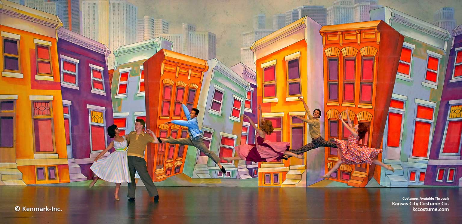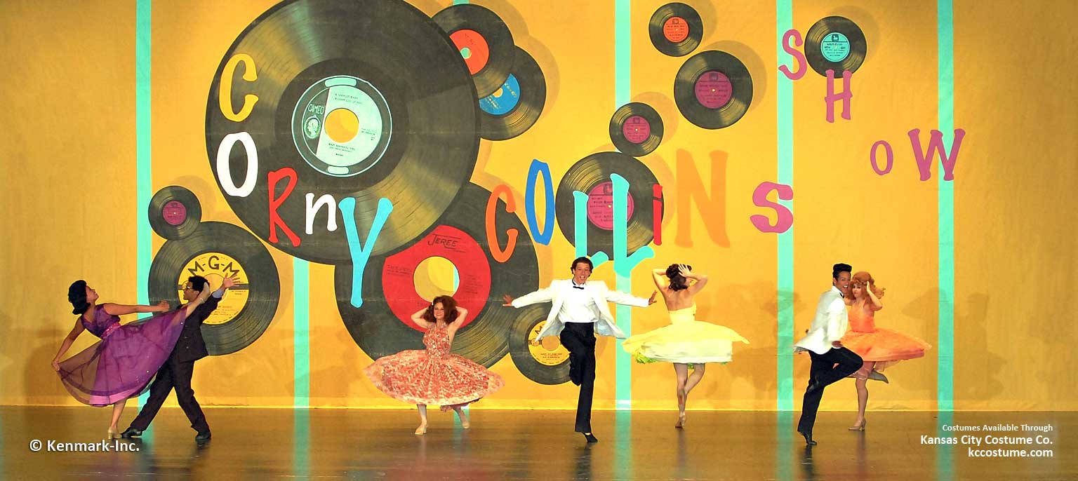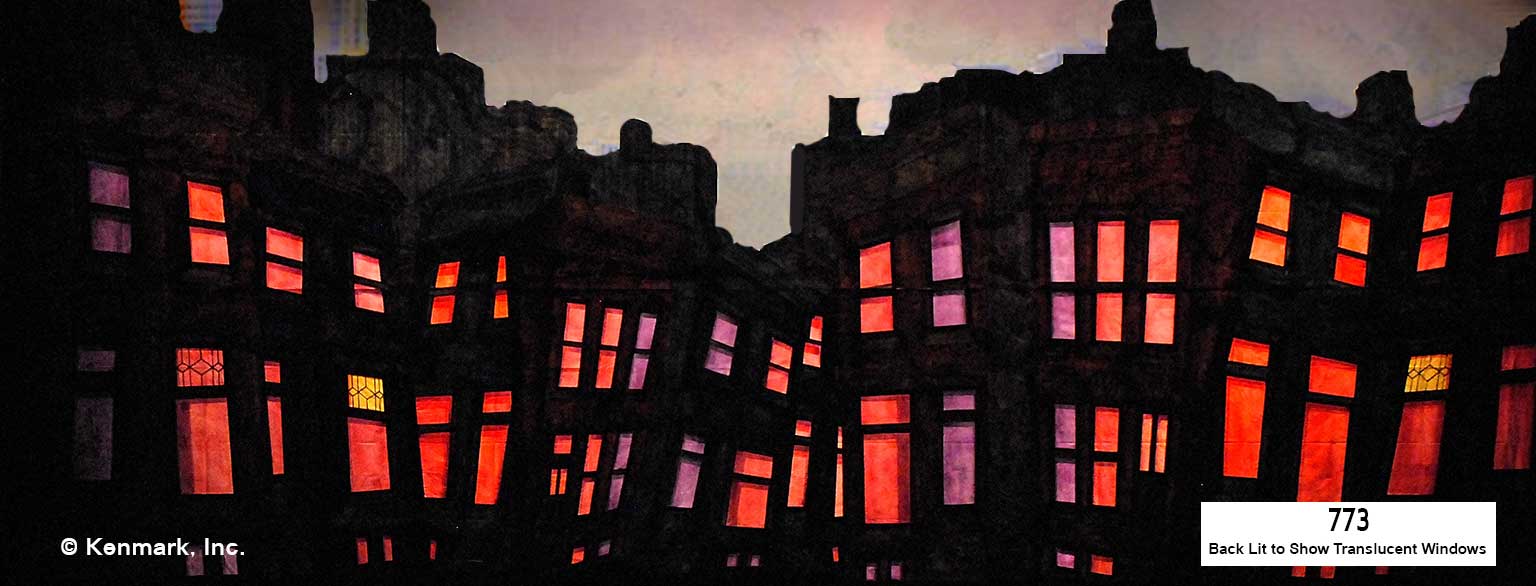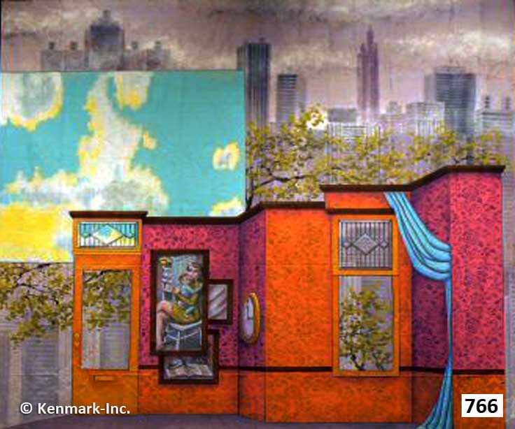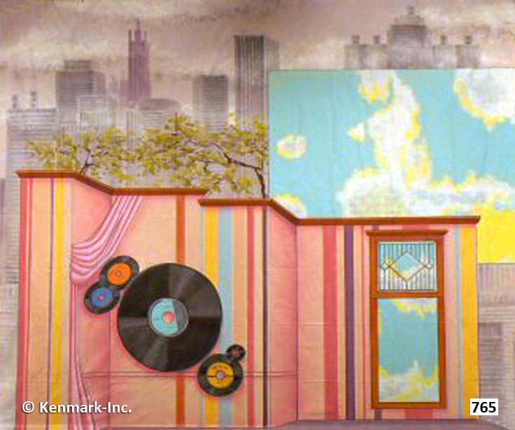 Beautifully hand-painted theatrical backdrops designed to provide continuity and quality to your “Hairspray” set. These are full-size drops measuring approximately 20′ x 50′ feet. Each drop has grommets and tie lines across the top and a pocket at the bottom so you can insert a pole to weight the drop. Drop ED773 Street Scene has translucent window and can be back lit to make the windows glow. The Hairspray Package 1 has a total of 13 drops, with a minimum order of 4 required unless your ship date is within the next 30 days. You must order at least 4 drops to receive the package price. For additional information, visit our Rental Policies page. Can’t do the whole package? Check out our individual backdrops for Hairspray! All full size backdrops are approximately 20’x50′. All tabs are 20’x24′. *Please note: This package contains a scrim. They are very fragile and require special handling. Repairs for damages start at a minimum of $100. The advantage of using scrims is that when lit from the front they appear mostly opaque to the audience, until a change in stage lighting (lighting from behind) makes them almost fully transparent. Scrims have a rectangular weave that is similar in size in its openings and design to a window screen. All prices are for a one week rental (Monday to Monday). A $500 deposit is required on all packages. Shipping is an additional charge. Renting for more than one week? Call 913-648-8125 for pricing!