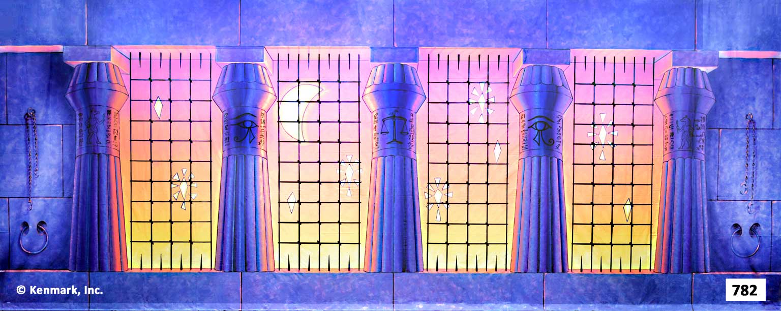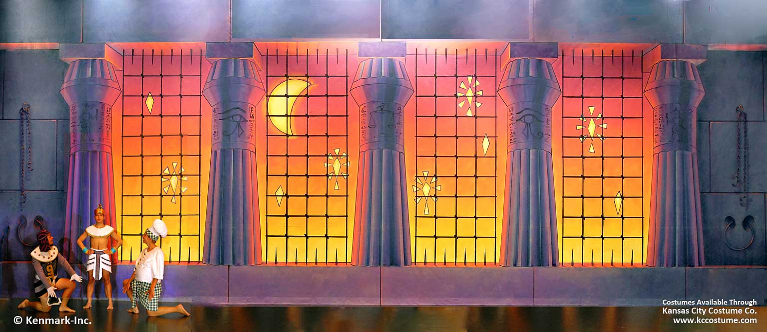 Beautifully hand-painted theatrical backdrops designed to provide continuity and quality to your “Joseph and the Amazing Technicolor Dreamcoat” set. These gorgeous drops are designed and hand-painted by Scenic Designer/Artist Susan Crabtree. They are full-size drops measuring approximately 20′ x 50′ feet. Each drop has grommets and tie lines across the top and a pocket at the bottom so you can insert a pole to weight the drop. The Joseph Package 1 has a total of 5 drops and you are required to order the complete package unless your ship date is within the next 30 days. You must order all 5 drops to receive the package price. For additional information, visit our Rental Policies page. All backdrops are approximately 20′ x 50′. All prices are for a one week rental (Monday to Monday). A $500 deposit is required on all packages. Shipping is an additional charge. Renting for more than one week? Call 913-648-8125 for pricing! Please note: This package contains a scrim. They are very fragile and require special handling. Repairs for damages start at a minimum of $100. The advantage of using scrims is that when lit from the front they appear mostly opaque to the audience, until a change in stage lighting (lighting from behind) makes them almost fully transparent. Scrims have a rectangular weave that is similar in size in its openings and design to a window screen.
