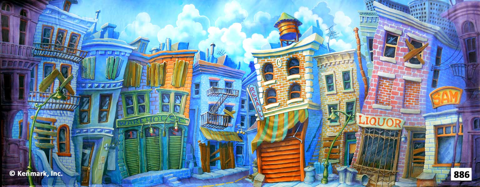 Beautifully hand-painted Broadway-caliber, theatrical backdrops designed to provide continuity and quality to your “Little Shop of Horrors” set. These gorgeous drops are designed by Scenic Designer Jason Phillips and will be hand-painted by Master Scenic Artist Susan Crabtree. They are full-size drops measuring 20′ x 48’. ED 887 Flower Shop backdrop has a slit so that you can use the Audrey prop with the drop. Each drop has grommets and tie lines across the top and a pocket at the bottom so you can insert a pole to weight the drop. The Little Shop of Horrors Package 1 has a total of 3 drops. You are required to order the complete package unless your ship date is within the next 30 days. You must order all 3 drops to receive the package price. For additional information, visit our Rental Policies page. All backdrops are 20′ x 48′. Can’t do the whole package? Check-out our individual drops for Little Shop of Horrors! All prices are for a one-week rental (Monday to Monday). A $500 deposit is required on all packages. Shipping is an additional charge. Renting for more than one week? Call 913-648-8125 for pricing!