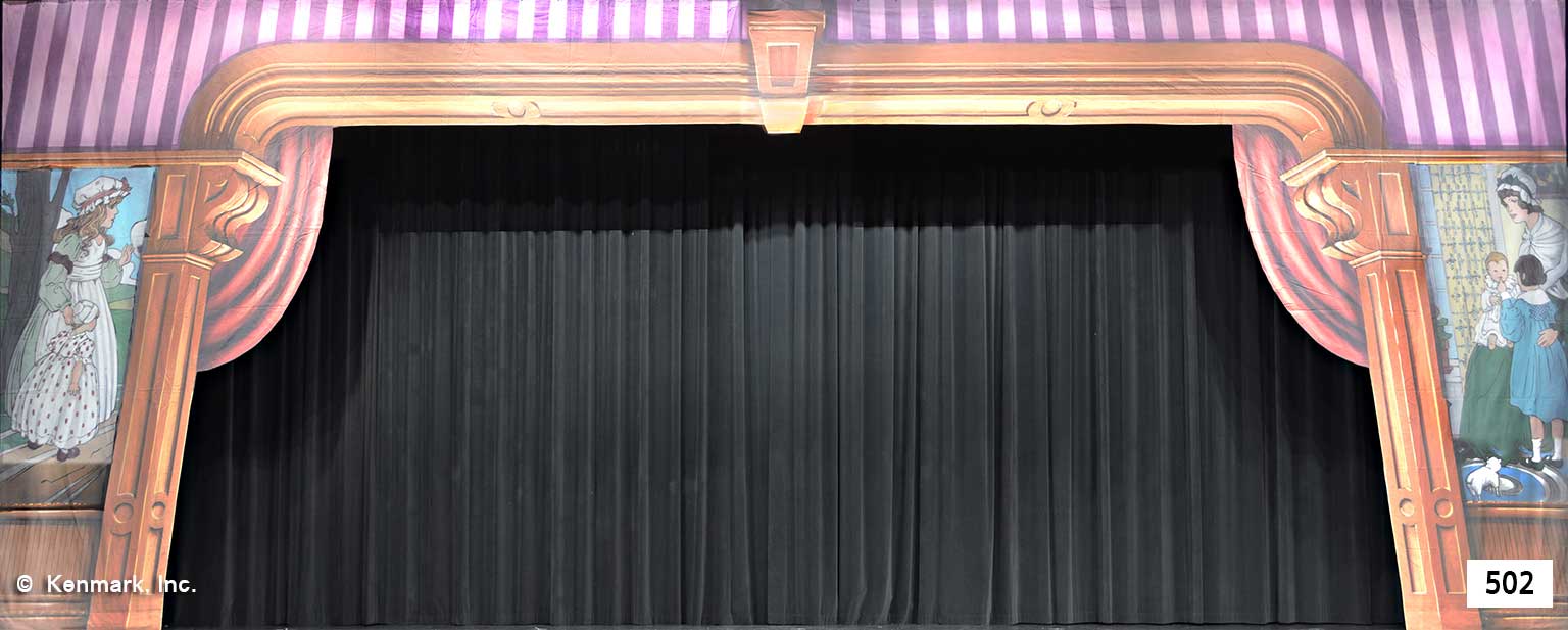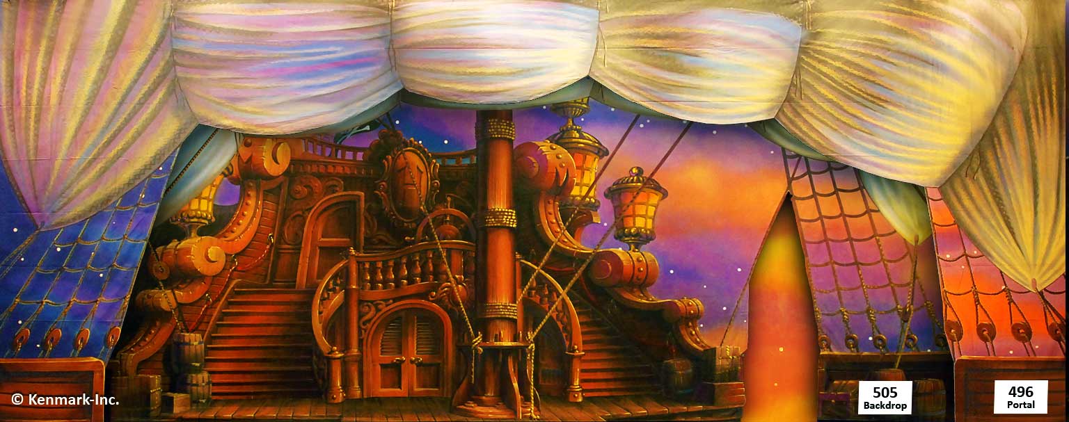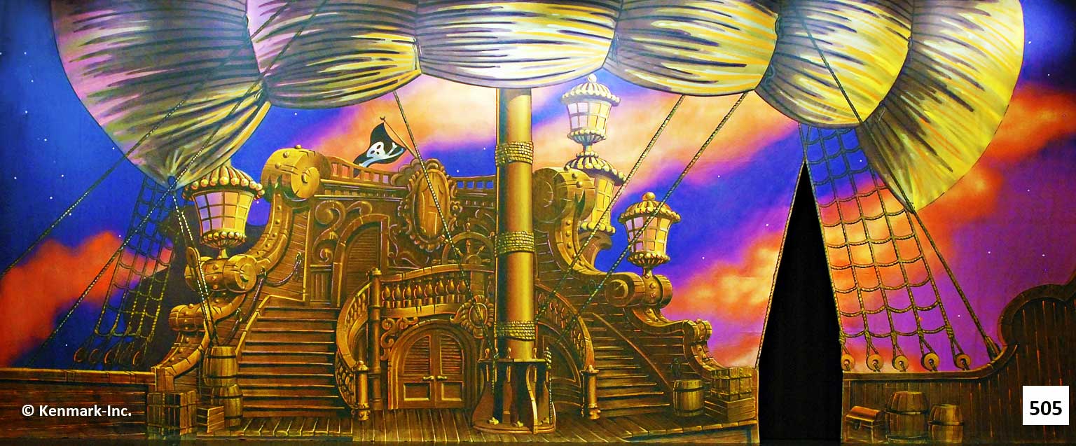 Beautifully hand-painted theatrical backdrops designed to provide continuity and quality to your “Peter Pan” set. These gorgeous drops are designed by Scenic Designer Greg Hill and hand-painted by Master Scenic Artist Susan Crabtree. They are full-size drops measuring approximately 20′ x 50′ feet. Each drop has grommets and tie lines across the top and a pocket at the bottom so you can insert a pole to weight the drop. The Peter Pan Package 1 has a total of 14 backdrops. You are required to order a minimum of 4 drops unless your ship date is within the next 30 days. You must order at least 4 backdrops to receive the package price. All backdrops are approximately 20′ x 50′ and all legs are approximately 20”. Have a smaller space? Check-out our 17′ x 45” package for this show! Can’t do the whole package? Check-out our individual drops for Peter Pan! For additional information, visit our Rental Policies page. All prices are for a one-week rental (Monday to Monday). A $500 deposit is required on all packages. Shipping is an additional charge. Renting for more than one week? Call 913-648-8125 for pricing! Please note: The Act Curtain backdrop is a scrim. They are very fragile and require special handling. Repairs for damages start at a minimum of $100. The advantage of using scrims is that when lit from the front they appear mostly opaque to the audience, until a change in stage lighting (lighting from behind) makes them almost fully transparent. Scrims have a rectangular weave that is similar in size in its openings and design to a window screen.
