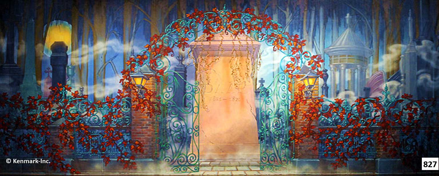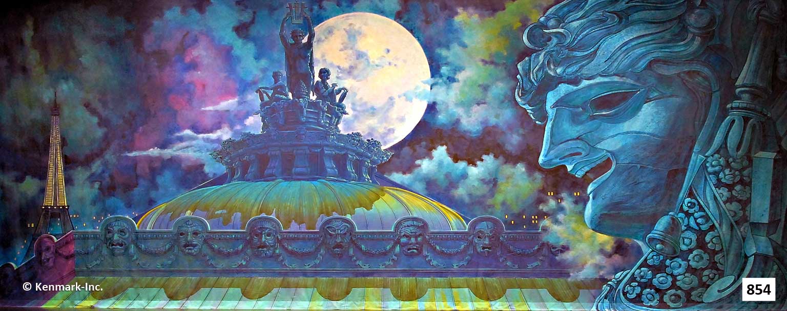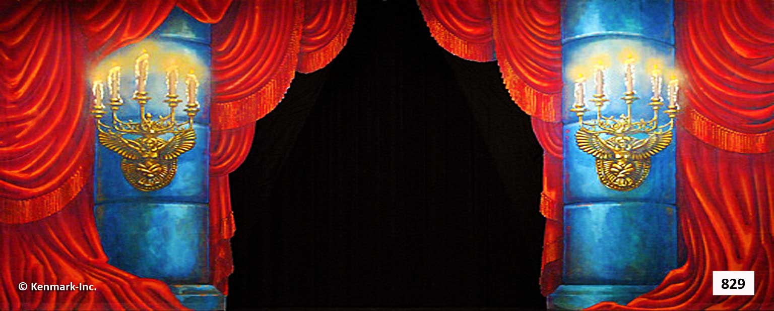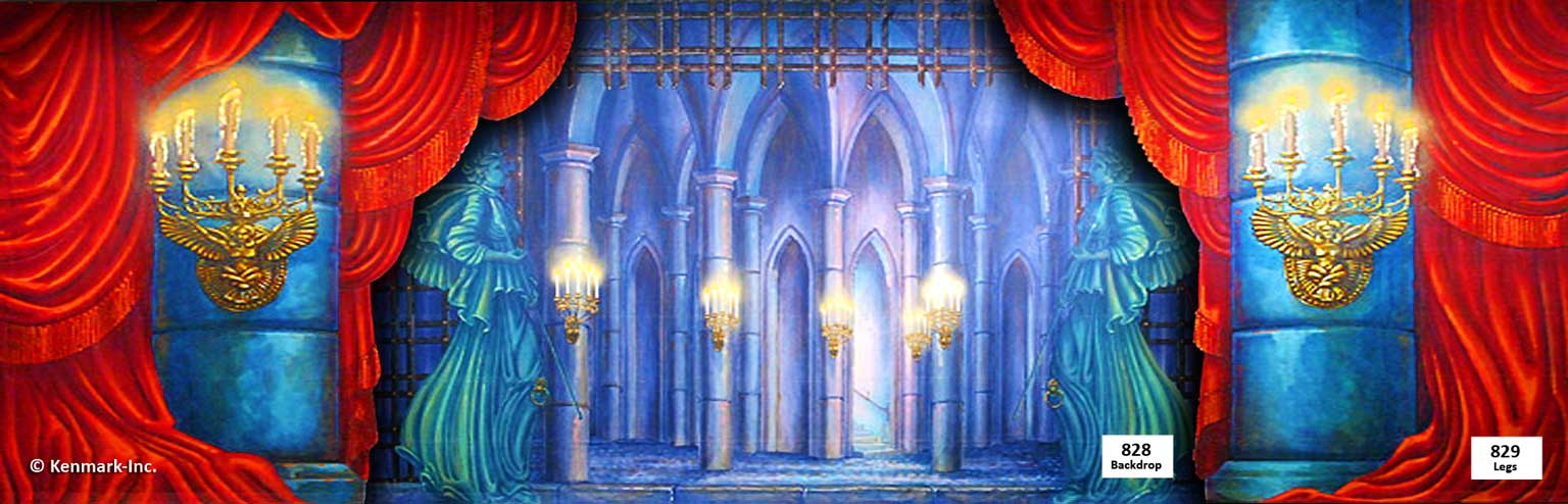 Beautifully hand-painted theatrical backdrops designed to provide continuity and quality to your “Phantom of the Opera” set. These gorgeous drops are designed by Scenic Designer Jason Phillips and beautifully hand-painted by Master Scenic Artist Susan Crabtree. They are full-size drops measuring approximately 20′ x 50′. Each drop has grommets and tie lines across the top and a pocket at the bottom so you can insert a pole to weight the drop. The Phantom of the Opera Package 1 has a total of 6 backdrops. You are required to order 4 backdrops from the package unless your ship date is within the next 30 days. You must order 4 drops to receive the package price. All backdrops are approximately 20’x50′ and the legs are 20′ high. Can’t do the whole package? Check-out our individual drops for Phantom! For additional information, visit our Rental Policies page. All prices are for a one-week rental (Monday to Monday). A $500 deposit is required on all packages. Shipping is an additional charge. Renting for more than one week? Call 913-648-8125 for pricing! Please note: This package contains a scrim. They are very fragile and require special handling. Repairs for damages start at a minimum of $100. The advantage of using scrims is that when lit from the front they appear mostly opaque to the audience, until a change in stage lighting (lighting from behind) makes them almost fully transparent. Scrims have a rectangular weave that is similar in size in its openings and design to a window screen.