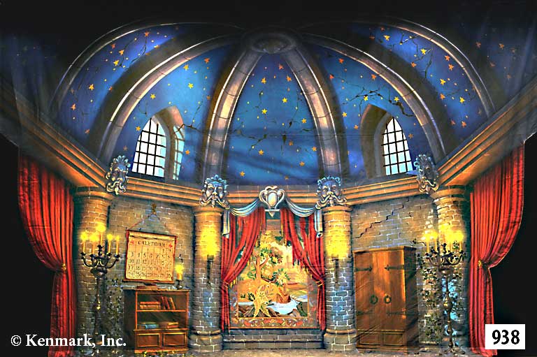 Shrek, the Musical – New! Beautifully hand-painted theatrical backdrops designed to provide continuity and quality to your “SHREK” set. These gorgeous drops are designed by Scenic Designer Gregory Hill and will be hand-painted by Master Scenic Artist Susan Crabtree. The full-size drops measure approximately 20′ x 48′. Each drop has grommets and tie lines across the top and a pocket at the bottom so you can insert a pole to weight the drop. All full-size backdrops and portals are approximately 20′ x 50′, the Dungeon Tab, Fiona’s Tower Tab and Stained-Glass Window Tab approximately are 20′ x 30′. Can’t do the whole package? Check-out our numerous individual backdrops for Shrek! For additional information, visit our Rental Policies page. All prices are for a one-week rental (Monday to Monday). A $500 deposit is required on all packages. Shipping is an additional charge. Renting for more than one week? Call 913-648-8125 for pricing! Please note: This package contains a scrim. They are very fragile and require special handling. Repairs for damages start at a minimum of $100. The advantage of using scrims is that when lit from the front they appear mostly opaque to the audience, until a change in stage lighting (lighting from behind) makes them almost fully transparent. Scrims have a rectangular weave that is similar in size in its openings and design to a window screen. Minimum Order of 4 Required Unless Your Ship Date is Within 30 days or less.