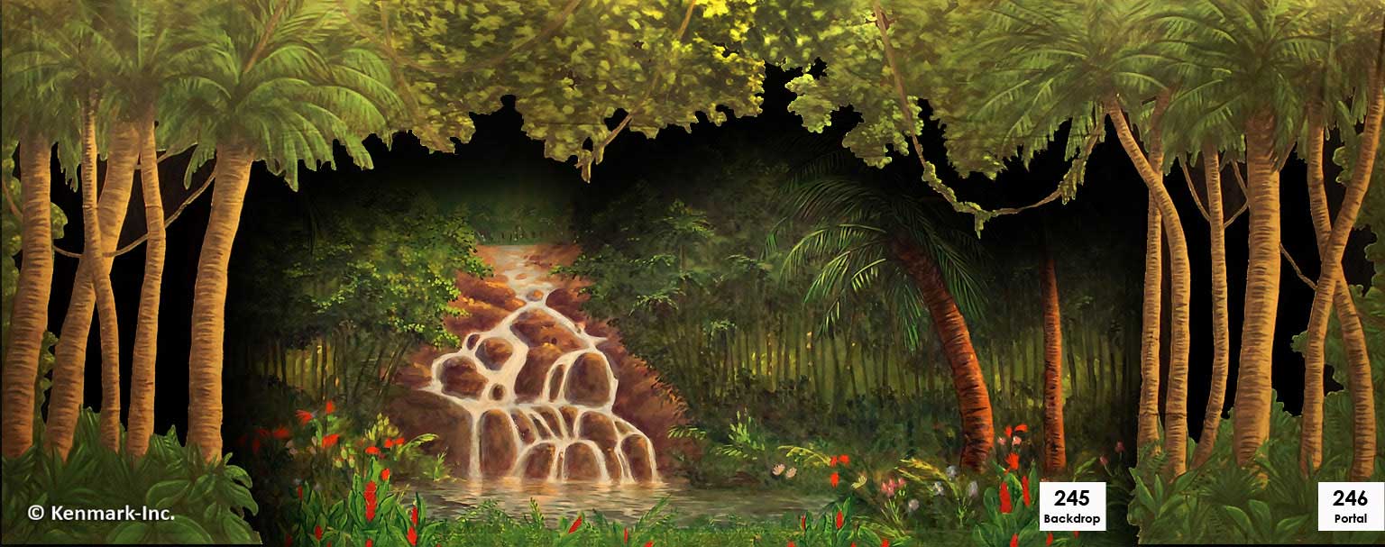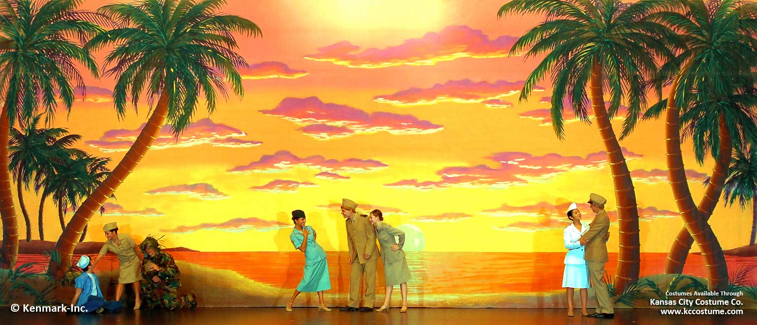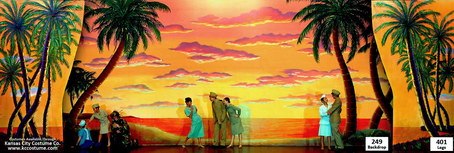 Beautifully hand-painted Broadway-caliber, theatrical backdrops designed to provide continuity and quality to your “South Pacific” set. These gorgeous drops are designed by Scenic Designer Jeff Aeling and painted by Master Scenic Artist David McClain. They are full-size drops. Each drop has grommets and tie lines across the top and a pocket at the bottom so you can insert a pole to weight the drop. The South Pacific Package 1 has 6 drops. There is no minimum order required, however you must order all 6 drops to receive the package price. Sizes: All Backdrops are approximately 17′ x 43' except D249 which is 17′ x 45′. Can’t do the whole package? Check-out all of our individual drops for South Pacific. For additional information, visit our Rental Policies page. All prices are for a one-week rental (Monday to Monday). A $500 deposit is required on all packages. Shipping is an additional charge. Renting for more than one week? Call 913-648-8125 for pricing!