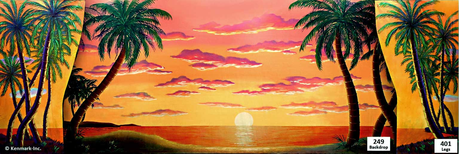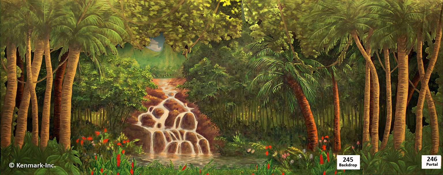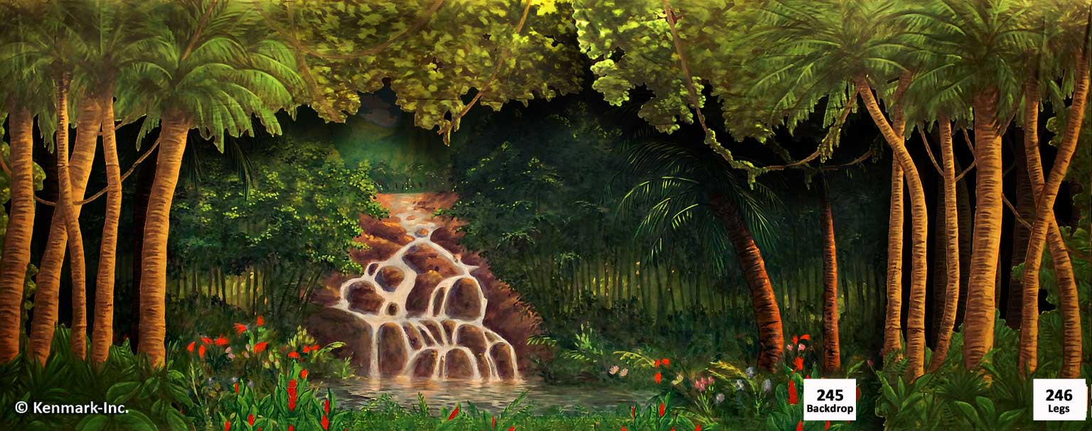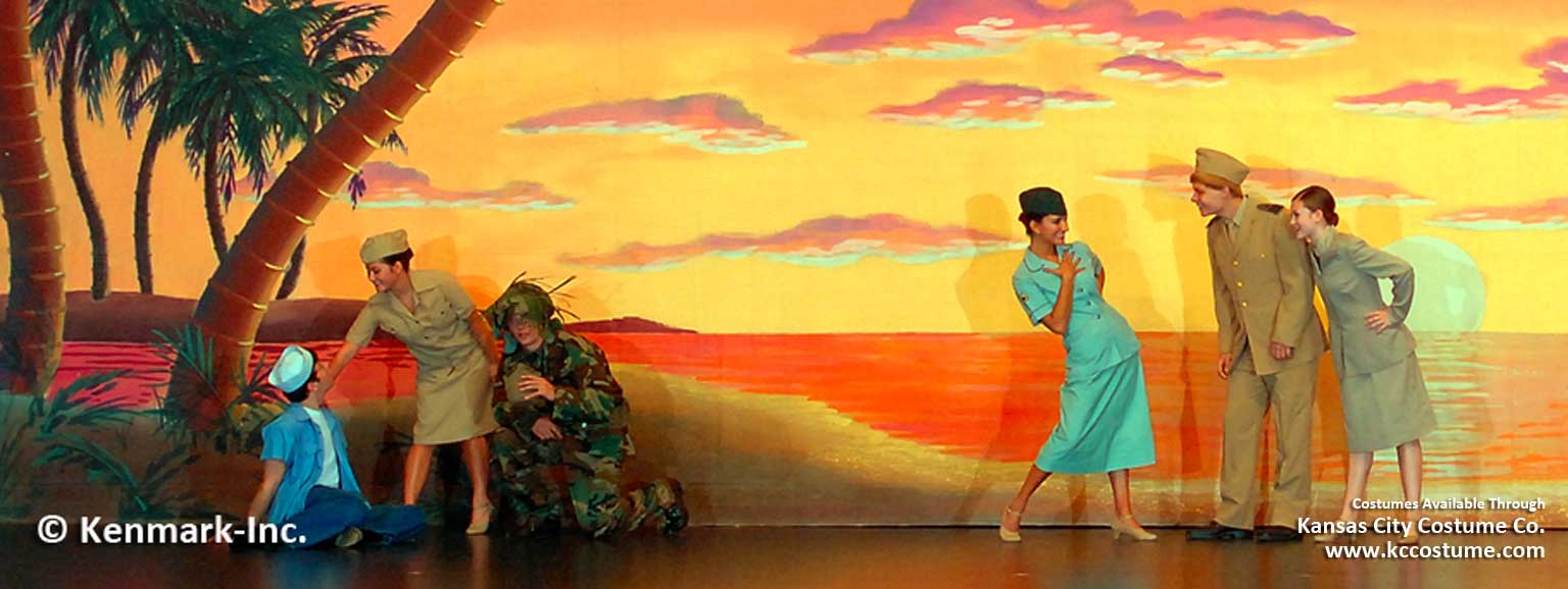 Beautifully hand-painted Broadway-caliber, theatrical backdrops designed to provide continuity and quality to your “South Pacific” set. These gorgeous drops are designed by Scenic Designer Jeff Aeling and painted by Master Scenic Artist David McClain. They are full-size drops. Each drop has grommets and tie lines across the top and a pocket at the bottom so you can insert a pole to weight the drop. The South Pacific Package 1 has 6 drops. There is no minimum order required, however you must order all 6 drops to receive the package price. Sizes: All Backdrops are approximately 17′ x 43' except D249 which is 17′ x 45′. Can’t do the whole package? Check-out all of our individual drops for South Pacific. For additional information, visit our Rental Policies page. All prices are for a one-week rental (Monday to Monday). A $500 deposit is required on all packages. Shipping is an additional charge. Renting for more than one week? Call 913-648-8125 for pricing!