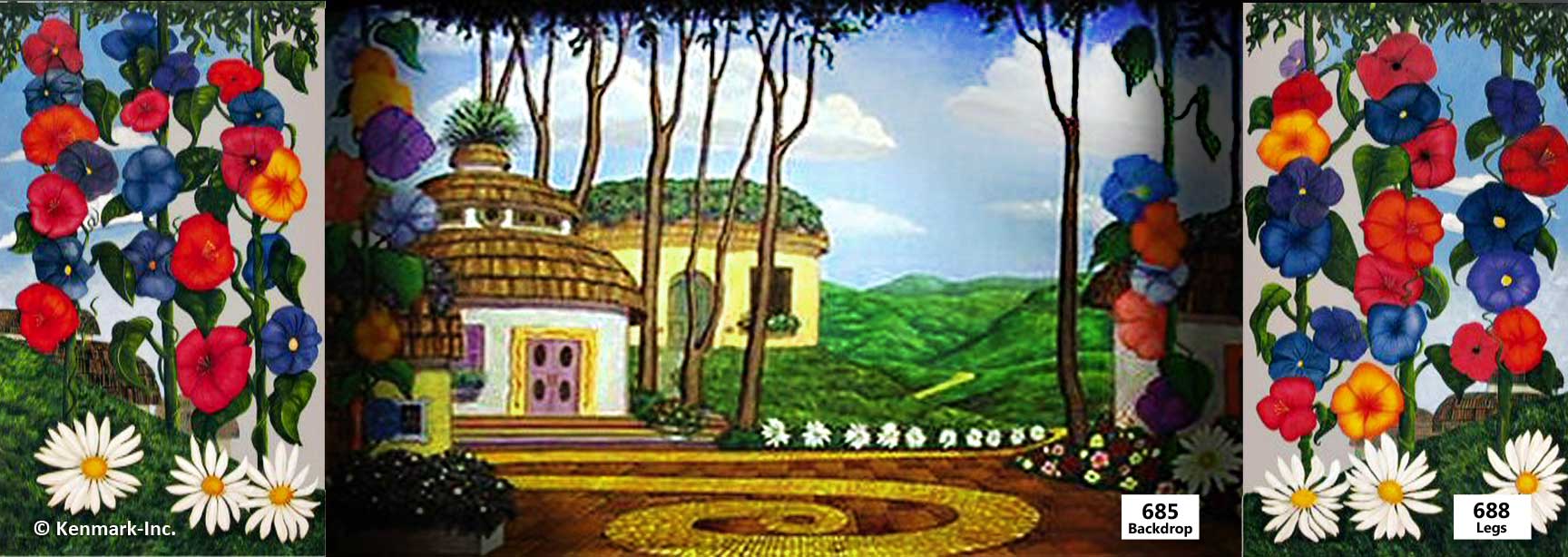 Beautiful theatrical backdrops designed to provide continuity and quality to your “Wizard of Oz” set. These gorgeous drops are designed by Scenic Artist Steve Goldblath and digitally printed. They are full-size drops measuring approximately 20′ x 50’’. Each drop has grommets and tie lines across the top and a pocket at the bottom so you can insert a pole to weight the drop. The Wizard of Oz Package 2 has 10 drops, with a minimum order of 4 required unless your ship date is within the next 30 days. You must order at least 4 drops to receive the package price. For additional information, visit our Rental Policies page. Need a smaller size? Check out one of our 17’ x 45’ packages for the Wizard of Oz. Can’t do the whole package? Check out our individual drops for The Wizard of Oz! All prices are for a one week rental (Monday to Monday). A $500 deposit is required on all packages. Shipping is an additional charge. Renting for more than one week? Call 913-648-8125 for pricing!